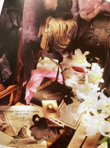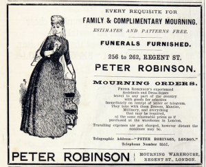 This is the oldest print source I have found connecting Throwaways to mourning. However, this is an artistic interpretation of what might have been or what a mourner could have seen, not a historical reconstruction. No sources are listed for the assumptions of any of the might haves. The handkerchief and teacup also don’t look like mourning paraphernalia to me, either. There was such a thing as mourning tea sets, but they weren’t white and pink. Mostly they were black and blue with phrases like Remember Me on them. Lavender was worn in later mourning, but it wasn’t bright. These seem more like pops of colour in an otherwise beige scene.