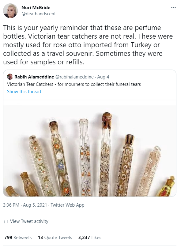 It seems like every year, my colleagues and I have to dispute the myth of Victorian Tear Catchers. I don’t know how or why disproving internet myths about perfume became my life, but here we are. So let’s go a bit deeper than space would allow in that tweet, and let’s hope I never have to write another word about these things again.