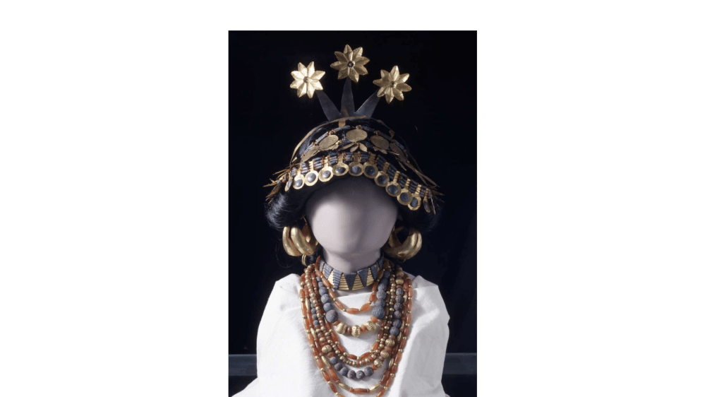 You will also see contemporary art depicting Tappūtī-Bēlet-ekallim wearing a horned or floral headdress. The horned headdress is an artistic convention for depicting gods in Mesopotamia. Those sculptures are of goddesses. The floral headdress is specifically the headdress of Queen Pu-Abi of Sumer from over 1,000 years before Tappūtī-Bēlet-ekallim lived. This is not how a skilled labourer in the Middle Assyrian Empire would have presented herself.